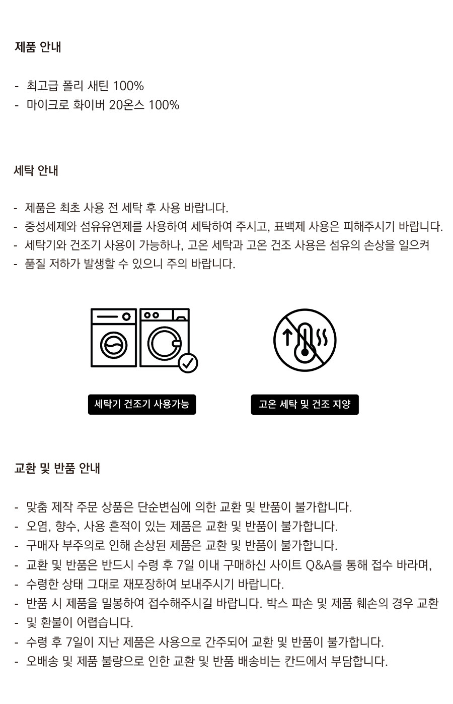 세탁기/건조기 사용가능 (고온세탁/건조 금지)
