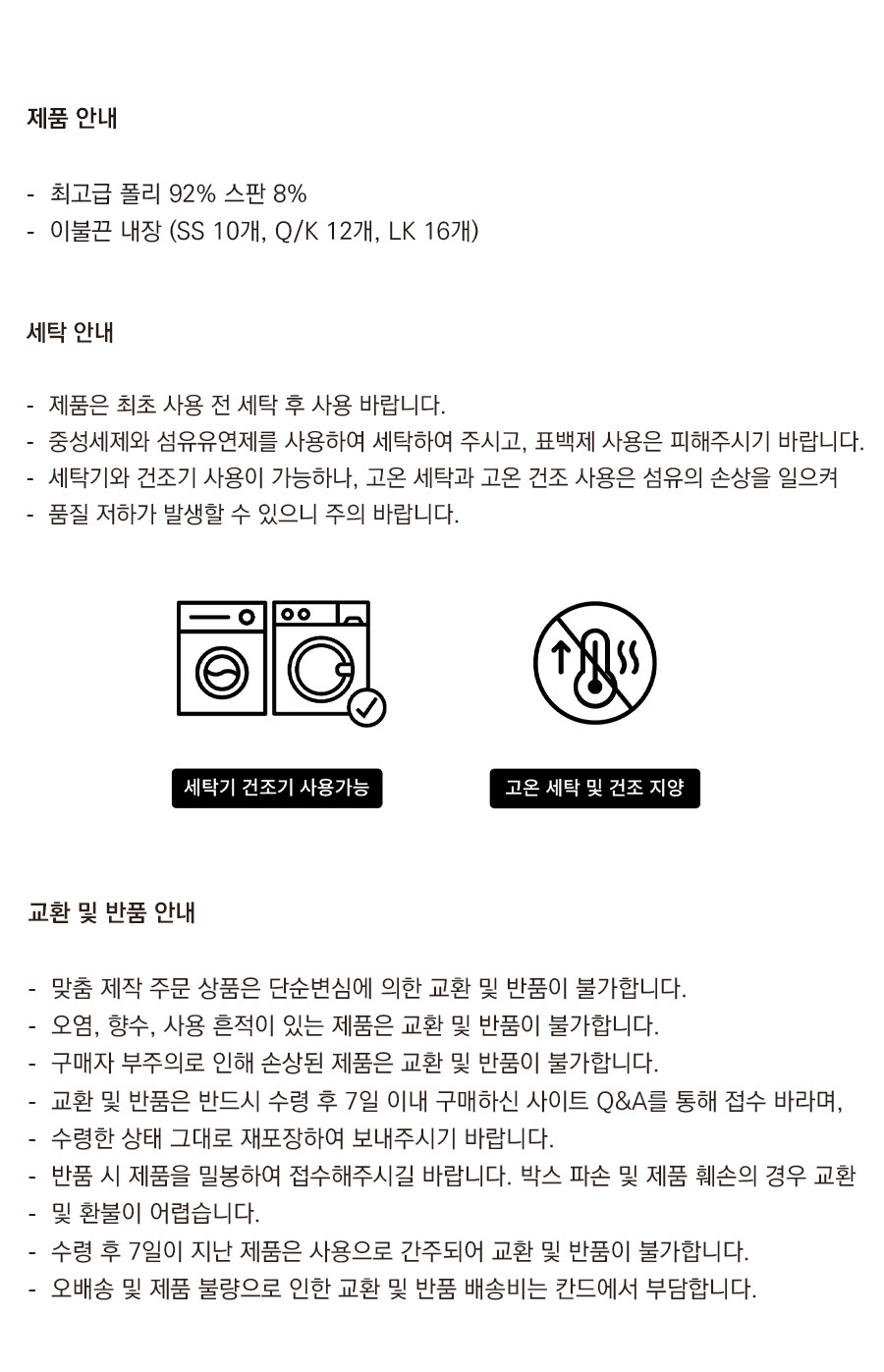 세탁기/건조기 사용가능 (고온세탁/건조 금지)